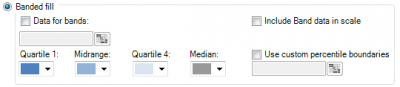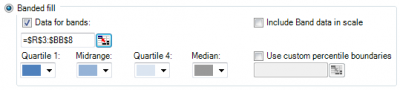 Bandlines are used to show how data is spread across a defined set. The user can decide how this is shown. The user can set the background color for Quartile 1, the Midrange (Q2 & Q3), and Quartile 4, along with the color of the Median line.