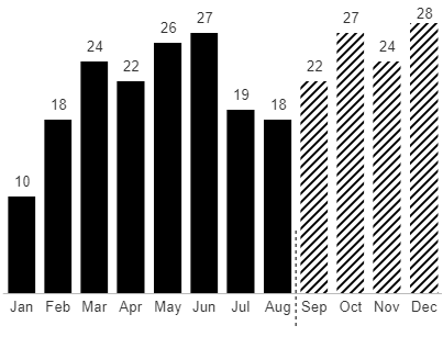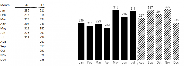 Actual values will be displayed as solid black columns. When there's no data for ‌Actuals, Forecast values are displayed instead with a diagonal fill pattern.
