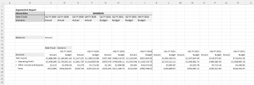 Here, we want to display the Actuals for 2020 and the budget for 2021. This will give us the relevant numbers for the past year and avoid showing empty columns for the year to come. We have set up an Excel range that contains the members we want returned. This will serve for later selections.