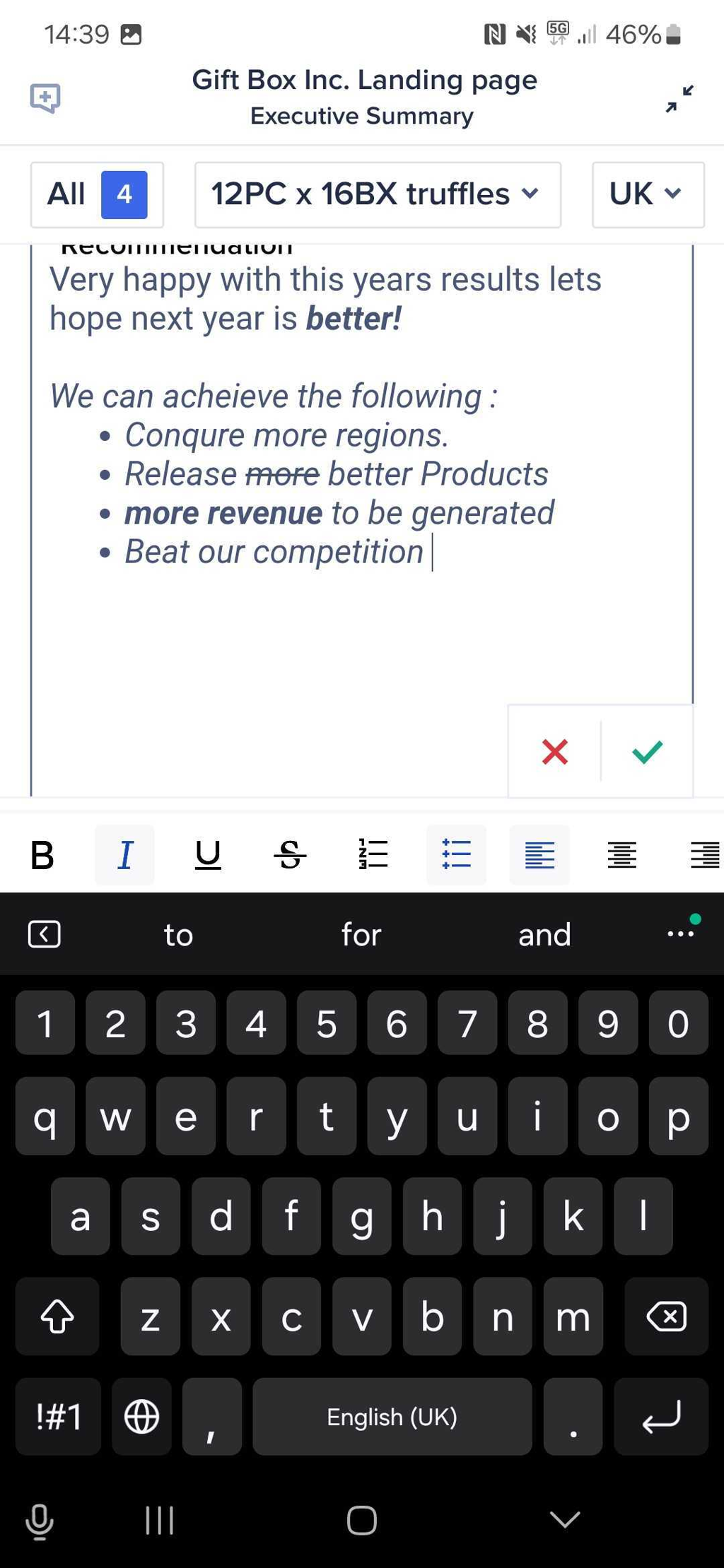 Users on Anaplan Mobile can now add rich text formatting to editable text in grids and field cards. This includes bold, italics, underline, strikethrough, text alignment, and ordered and unordered lists.