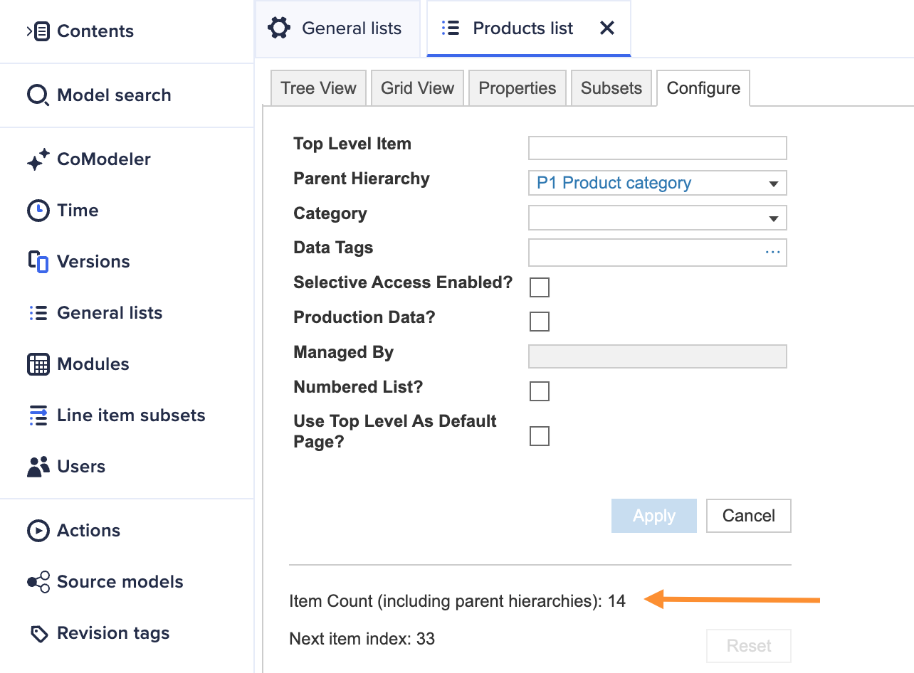 - Exceeding the limit: If an action, such as adding a dimension or importing list members, causes a line item's DIT to exceed 64, that action fails and the model displays the following error message: