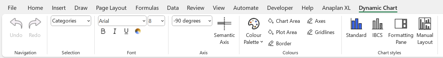 A ribbon for formatting a dynamic chart is visible whenever the dynamic chart task pane is open. You can edit the currently selected dynamic chart.
