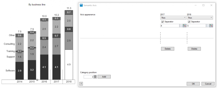This allows you to set the axis as a thin, thick, or double in appearance and enable a separator at any category number.