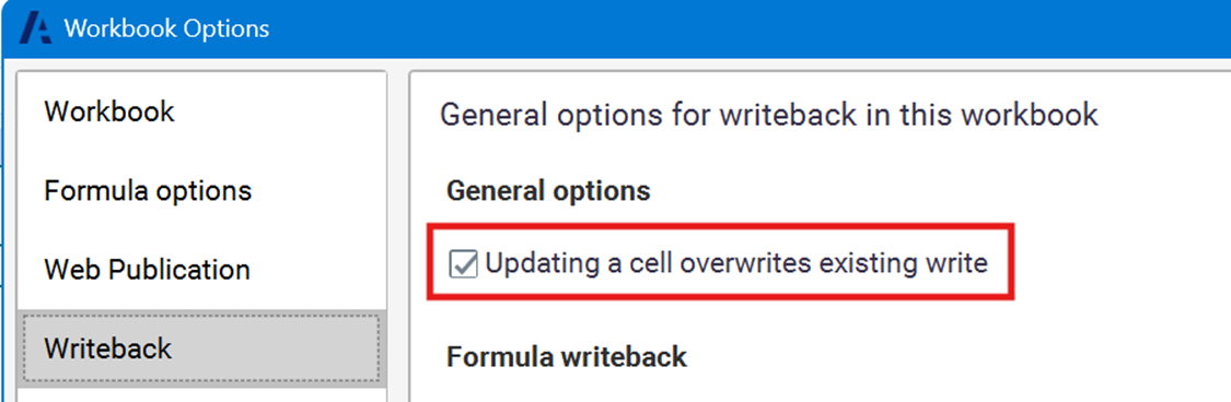 You can now select an Updating a cell overwrites existing writes workbook option. This enables you to control whether only the last entry, or all subsequent entries to the same cells are kept in the Writeback Task Pane.