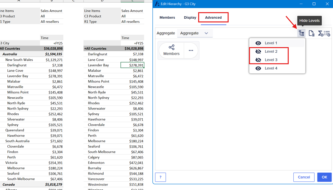- Support for hidden levels in grids for Anaplan and Anaplan Financial Consolidation & Reporting. In the Advanced section of the member selector, you can now choose to hide levels. This setting will be applied when dynamic selection steps are used, or when drilling down on members.