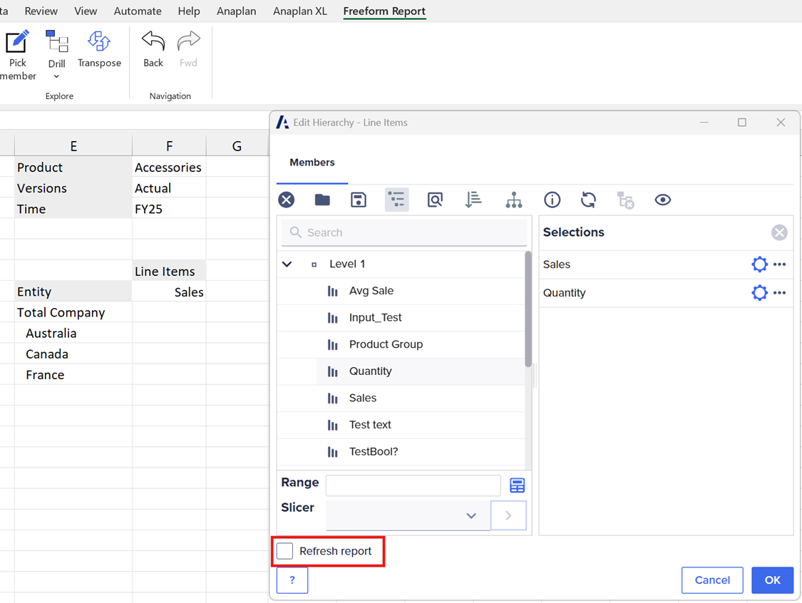 We've added the Refresh Report option, so you can now specify whether the freeform report should be refreshed when new members are selected.