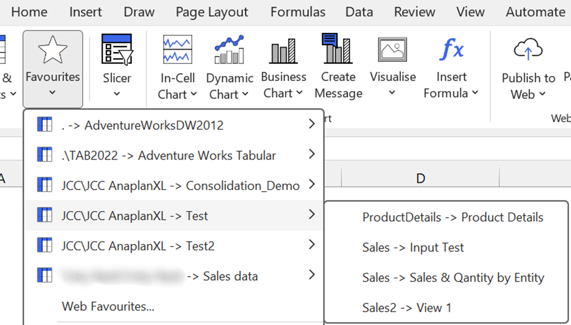 Favourites now has a two-level menu to streamline your experience. The first level shows the workspace (server) and model (database), while the second level shows the module (cube), and favourite name.