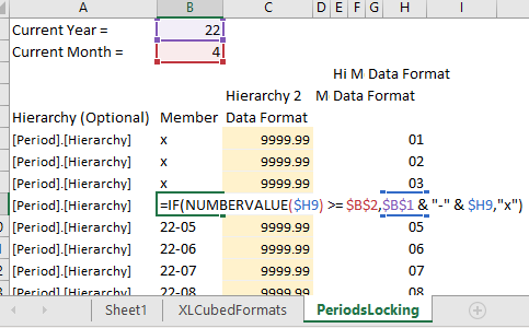 The current and future periods are unlocked in the custom formatting range thanks to Excel logic.