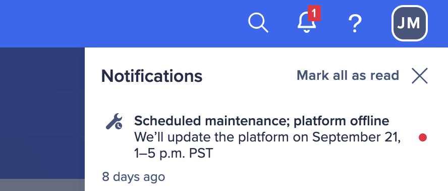In addition to in-product notifications, users will continue to receive notifications for upcoming downtime windows in the following formats: