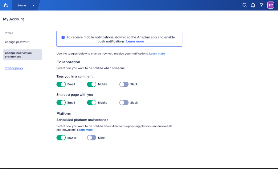 Users who have the Anaplan Slack app installed will also receive a Slack notification. Plus, those who have the Anaplan Mobile app installed on their device, will also receive a Mobile push notification.