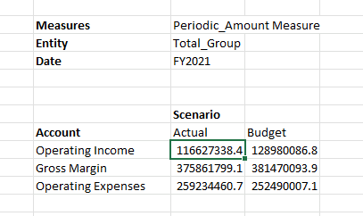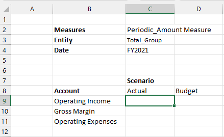 - The dimensions to use as filters, such as Measures, Entity, and Date, must vertically align with the outermost row dimension, such as Account, three rows above the column dimensions.