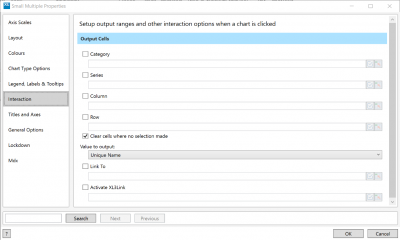 These output properties are configured in the properties for the chart control, as shown in the screenshot. To track an element, select the relevant checkbox and chose the desired output cell.
