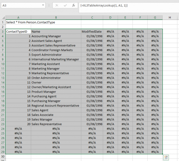 この例では、セル A1 に SQL ステートメントがあります。結果の出力先にする範囲を選択し、次のように入力します。Select * From Person.ContactType