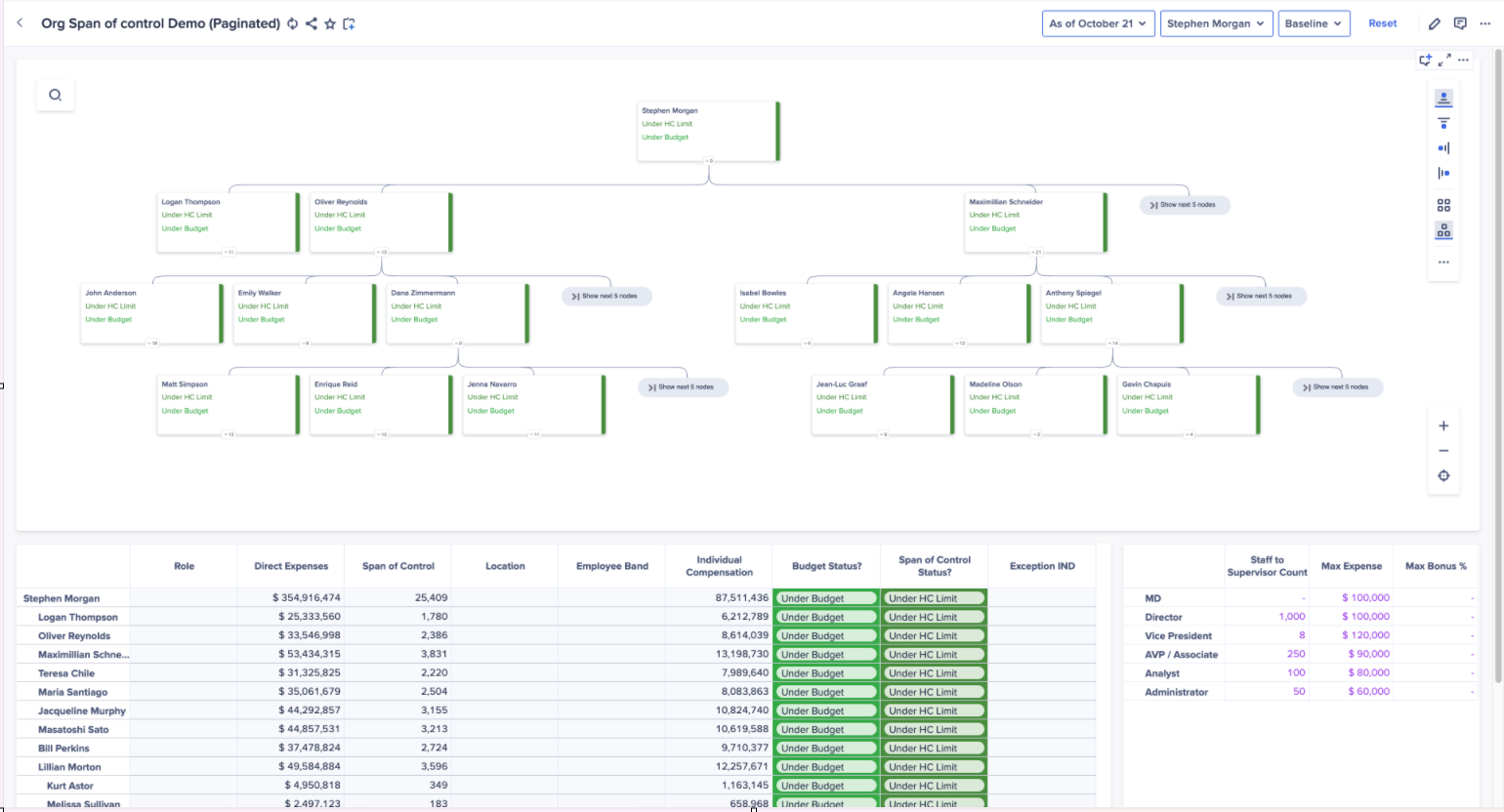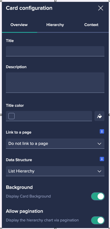 Page builders can use the Allow Pagination toggle to turn pagination on or off. When pagination is off, the chart will attempt to display all nodes at each level without pagination, which is ideal for smaller hierarchies.