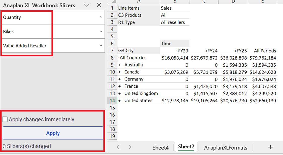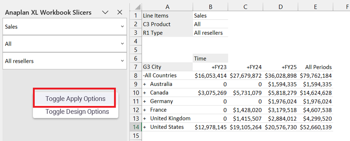 Toggle Apply Options is now available in the Workbook Slicer pane via the right-click menu. This lets you activate the deferred refresh option, and to change the selected values in multiple slicers. Refresh is only triggered when you select the Apply button.
