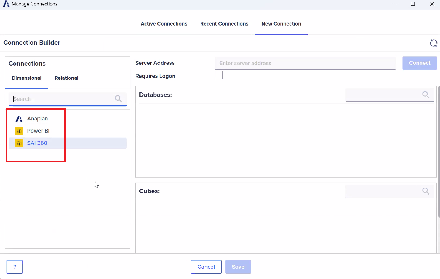 You can restrict the list of available connectors in the connection screen of Anaplan XL. This control can be customer-specific. In this example, the available connectors are limited to Anaplan and Power BI.