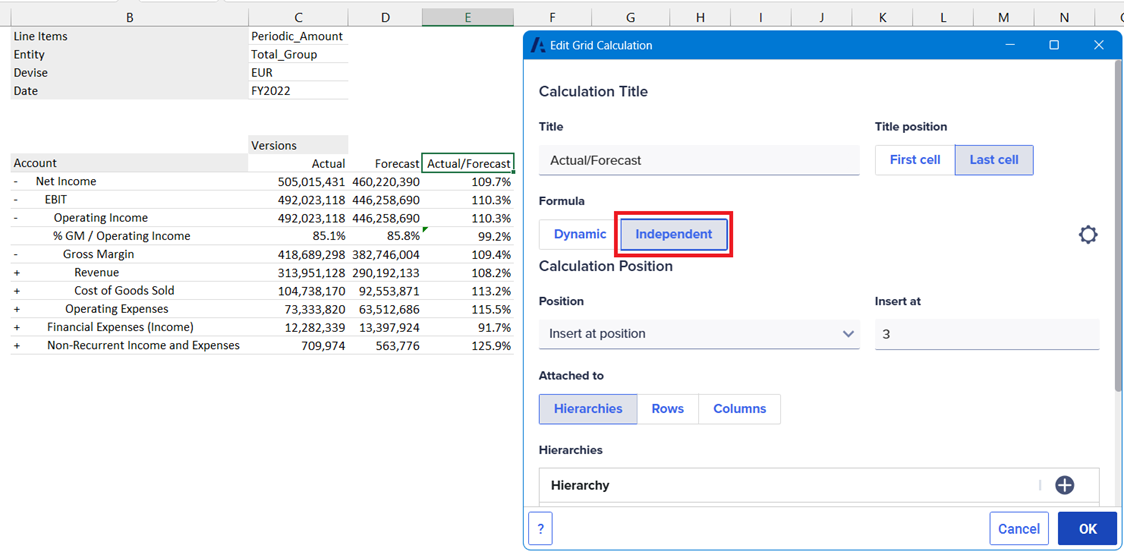 When a grid calculation is added, the same formula is applied to the entire column or row. This formula is automatically copied or deleted if the number of rows or columns changes.
