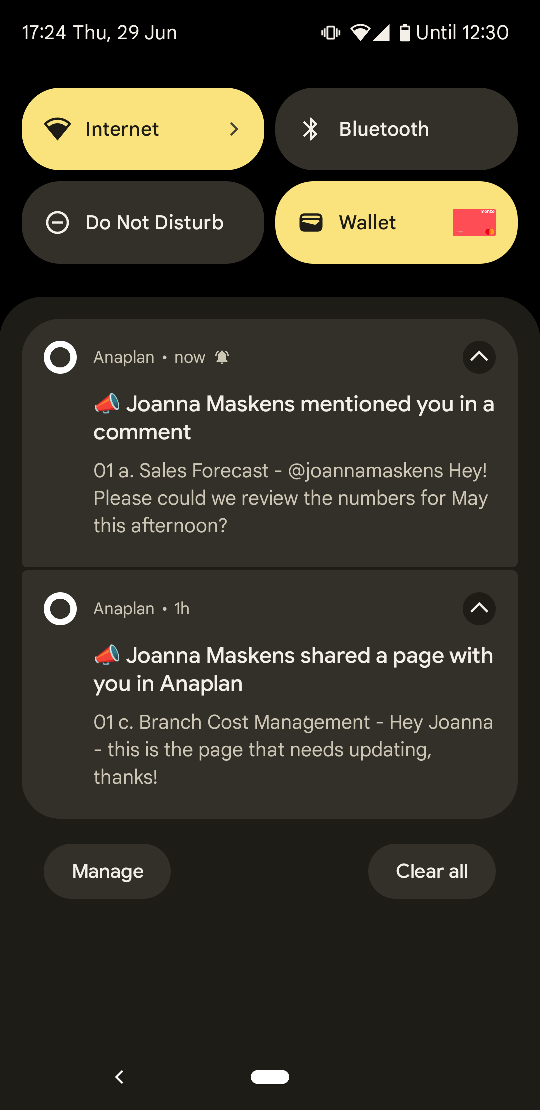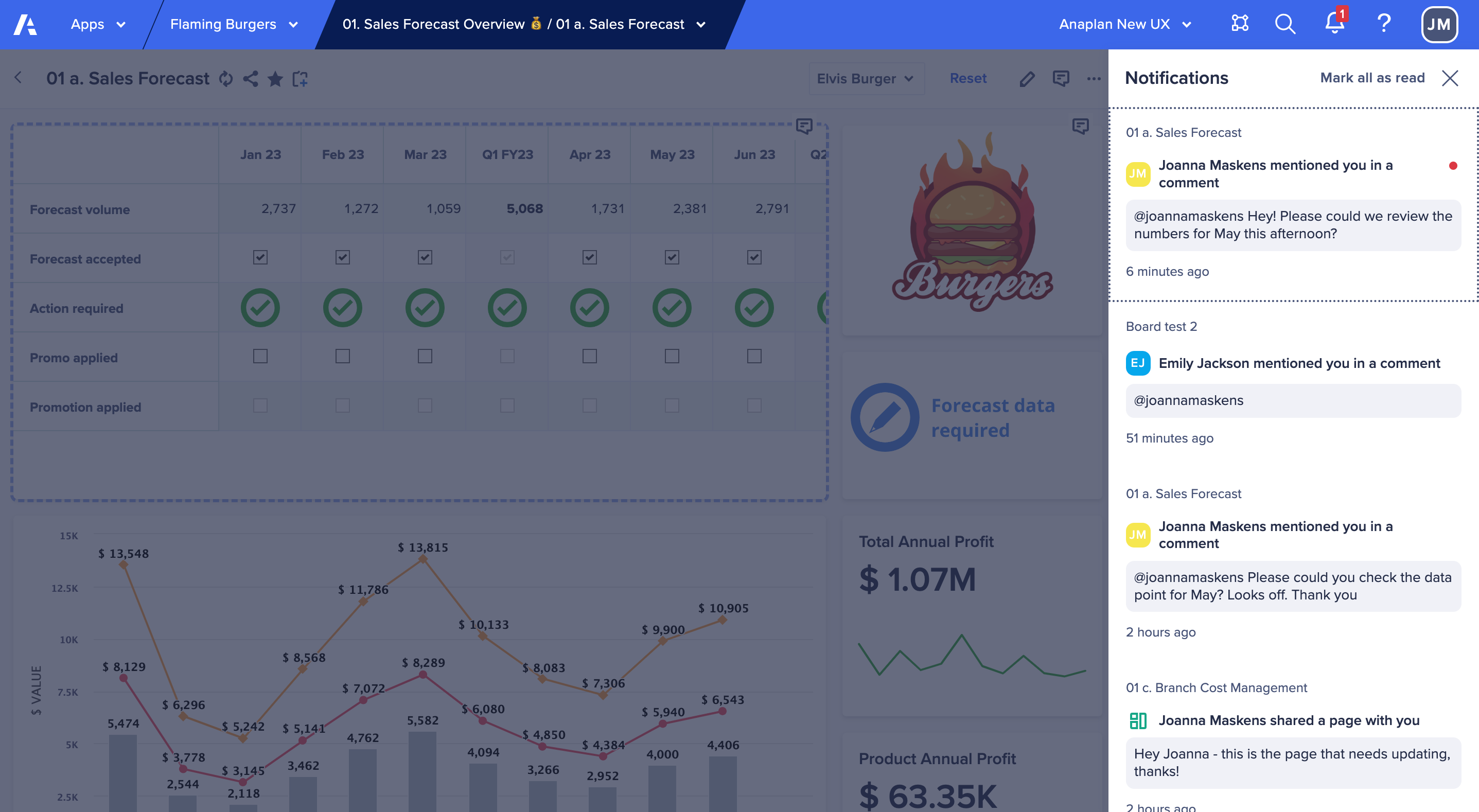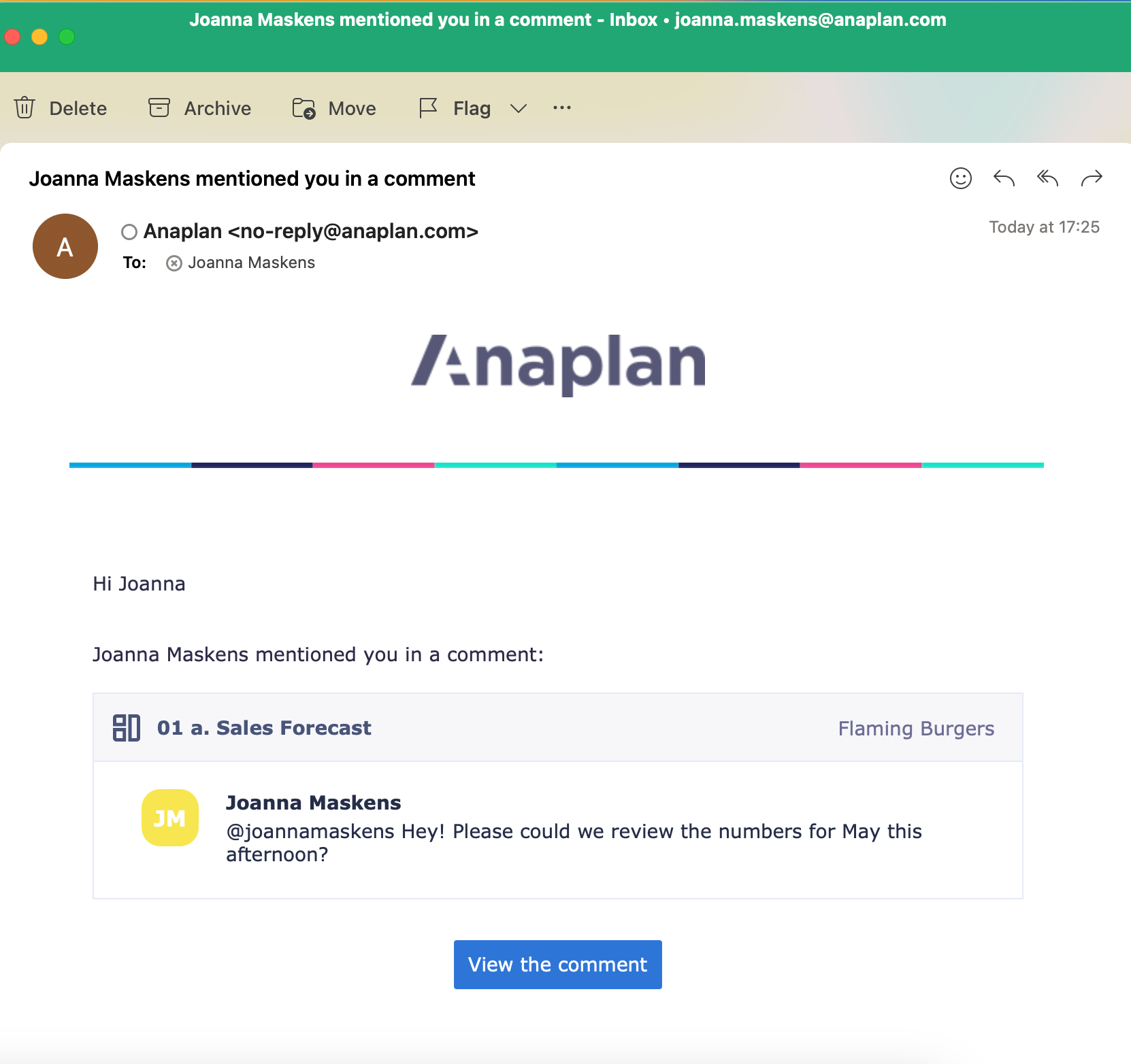 - Detailed notifications (with message preview): Notifications include message previews inside Anaplan and via mobile push, Slack & email. This saves time and keeps users informed even when they’re not logged into the platform.