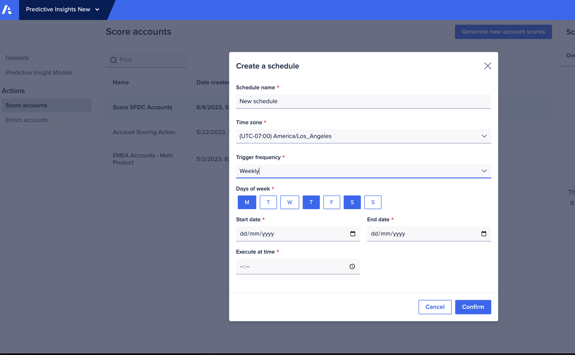 - Automatic scheduling in Predictive Insights: Introducing the new scheduler in Predictive Insights! Users can effortlessly make sure that their PI actions run with the latest and most complete data, removing manual overhead. With automated data refreshes, configurable scheduling options, and notifications, users can make data-driven decisions with ease.