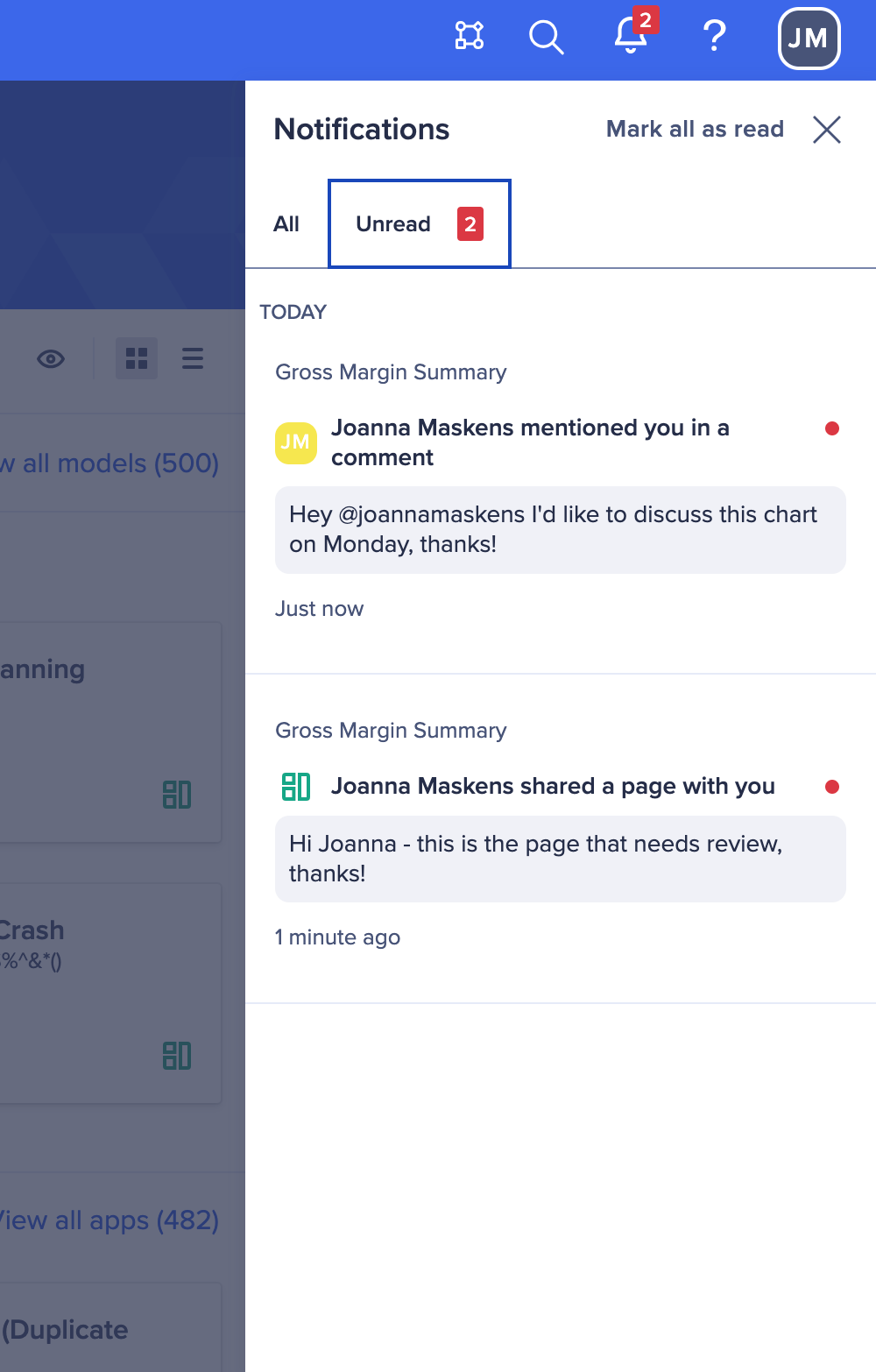 - All/Unread notification tabs: Filter the notification panel to show unread notifications only.