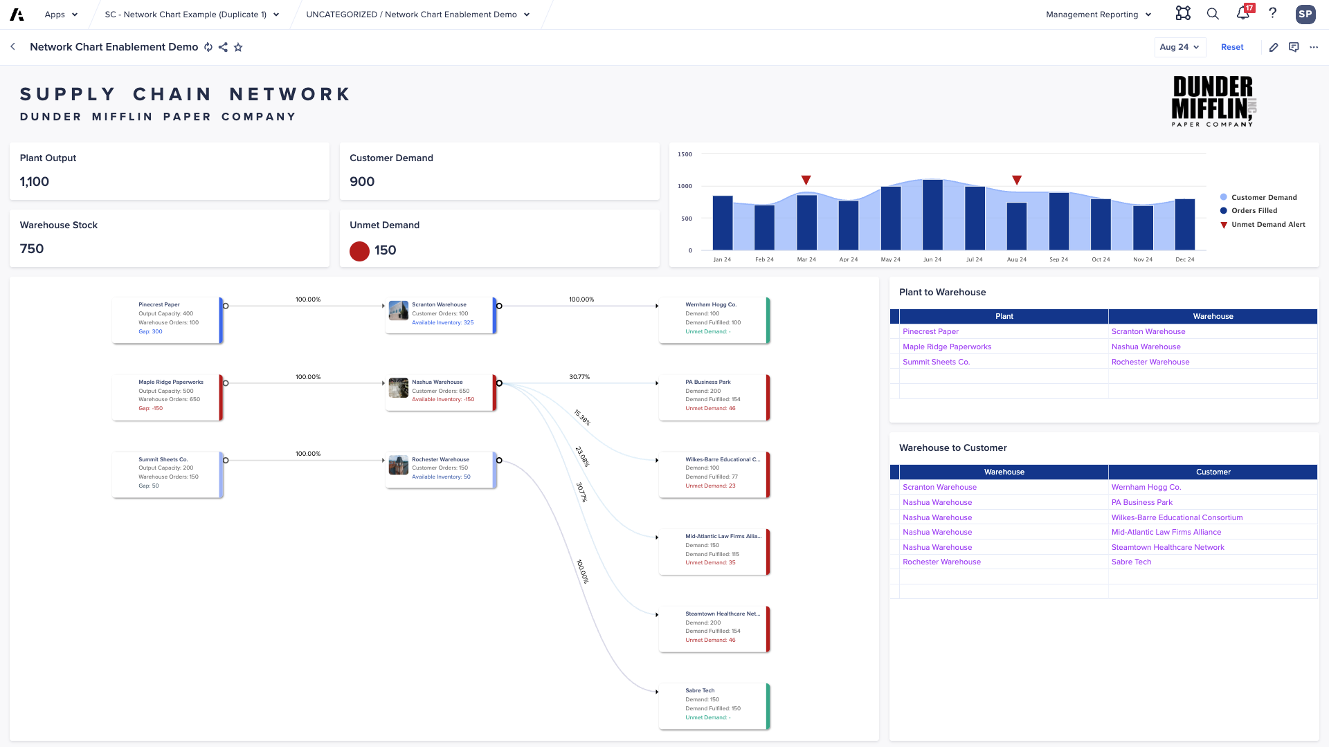 You can now select line items to use as labels on the connections in Network charts. For example, you can add a label to show the percentage allocation or volume of goods through a connection.
