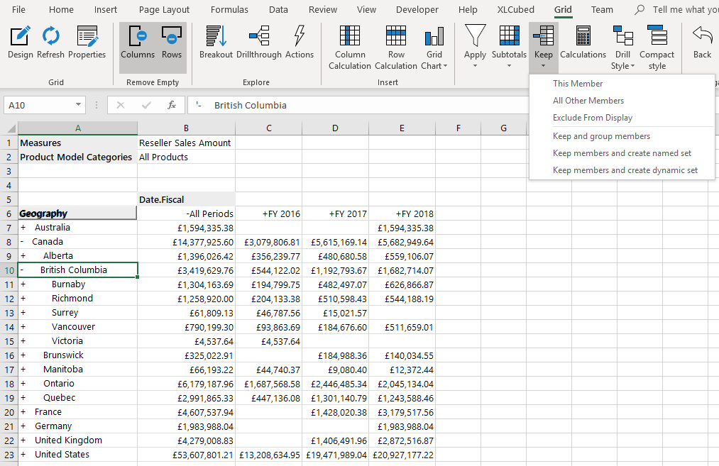 The Keep menu option allows you to quickly remove unwanted members from a grid report. Select the cells containing the members to keep/exclude and select Keep from the grid ribbon. You can also use the right-click option Anaplan XL Reporting > Keep....