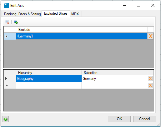 - Exclude From Display: The selected members will be removed from display. You can remove combinations across hierarchies. A red flag will appear on the axis to warn that rows/columns are being restricted. Right-click on it, Anaplan XL > Axis > Edit Axis.. to edit the axis setup. Here you can change the members being excluded, or have the selections driven from an Excel range.