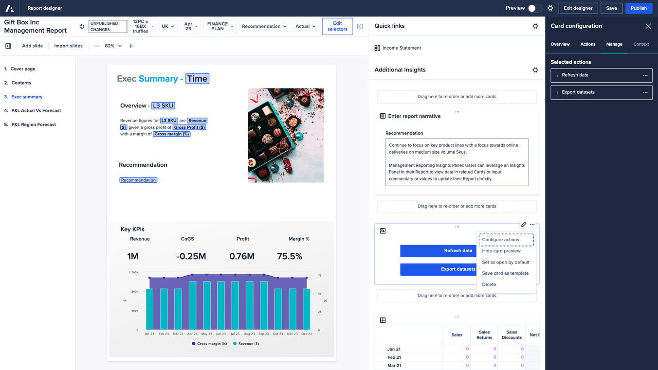 Export underlying report data via an Export action. - Update the data using Optimiser or PlanIQ via a Process action in the Insights panel.