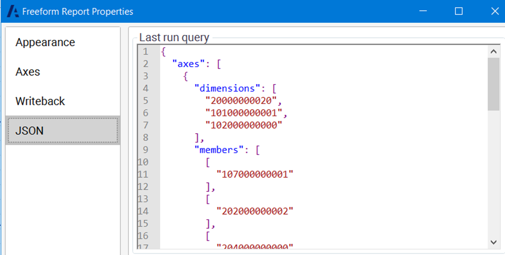 • Enable you to see the query text used to refresh a Freeform report. This is available from the JSON or MDX section of the Freeform report properties window, depending on the data source type used.