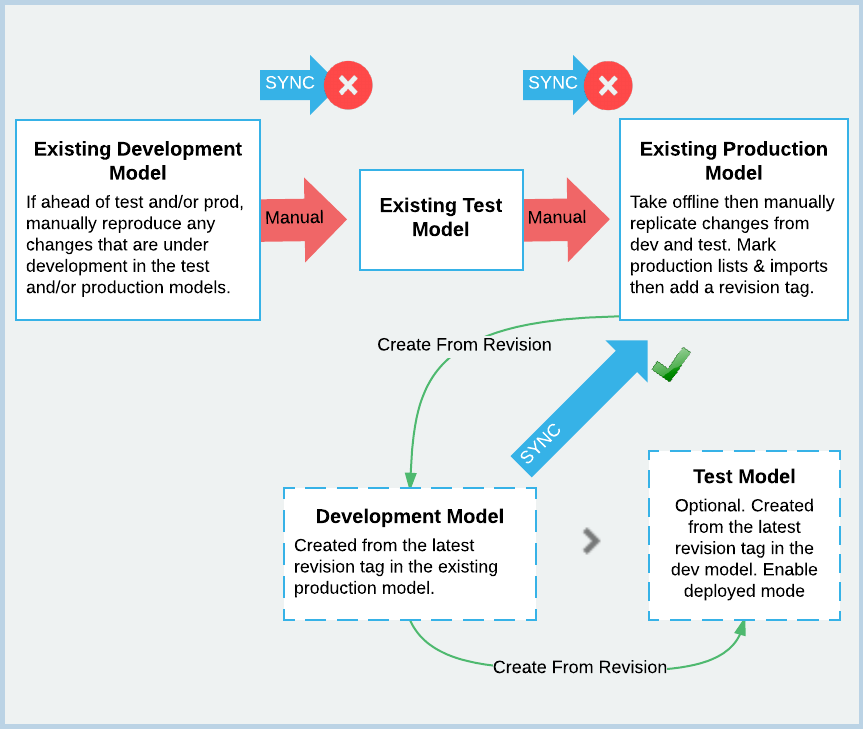 - In your production model, manually replicate any outstanding changes from your existing development or test models.