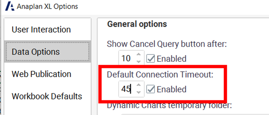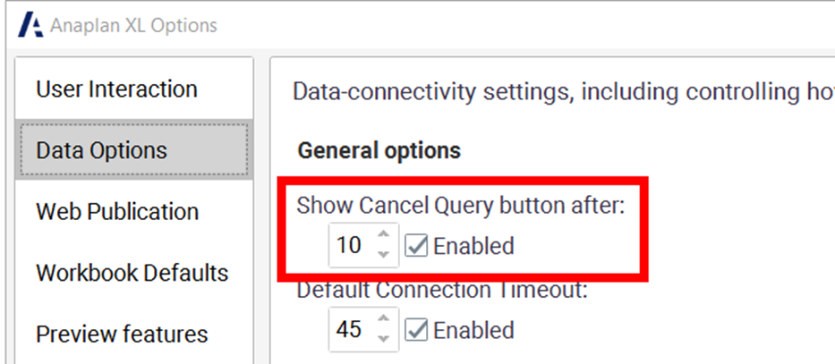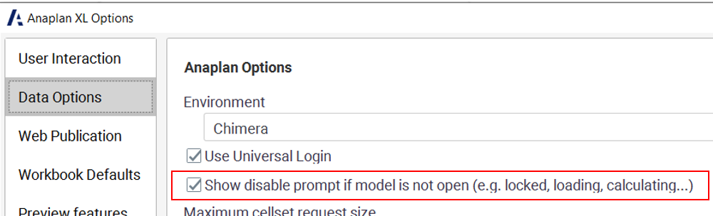 • We've improved how we handle unavailable models. If an Anaplan model is unavailable when a workbook is opened, a dialog will appear, enabling you to turn off Anaplan XL. This will prevent further connection error messages from being displayed. Anaplan XL can then be reactivated by selecting Activate Workbook in the ribbon. You can enable this settings in Data Options