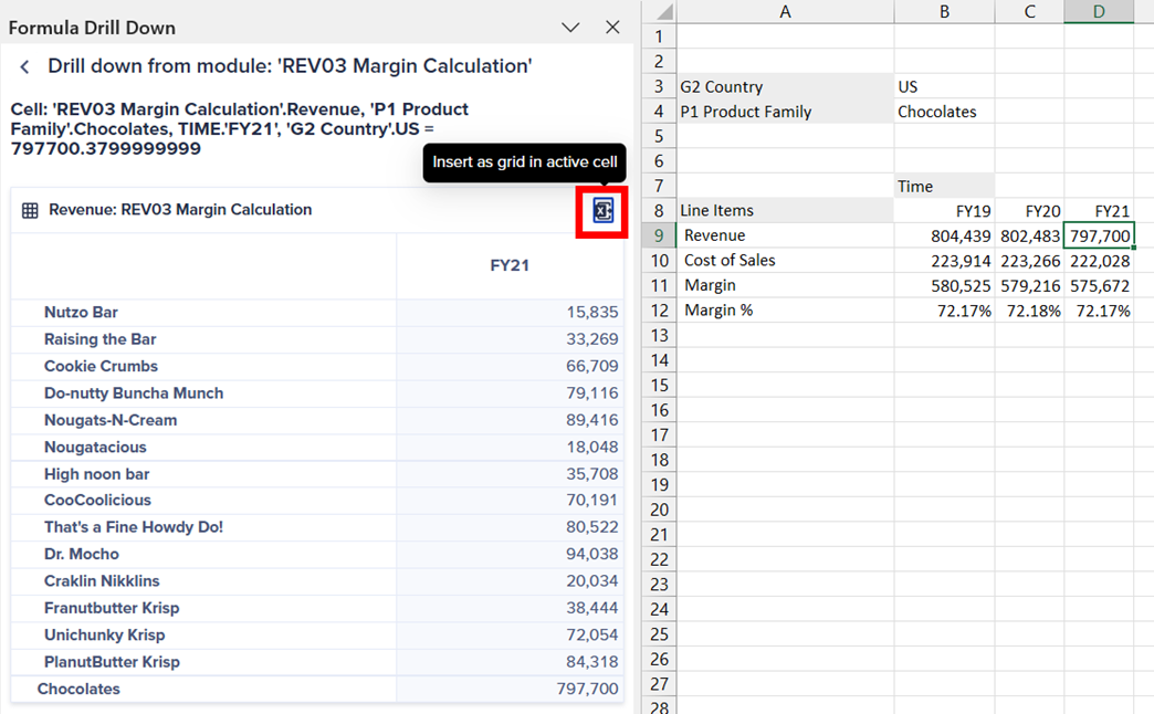 • Insert the current drill-down view as a new grid by selecting Insert as grid in active cell in the Formula Drill Down pane.
