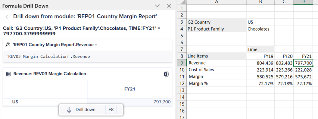 • Select a grid cell, then select Formula Drill Down... from the right-click menu.