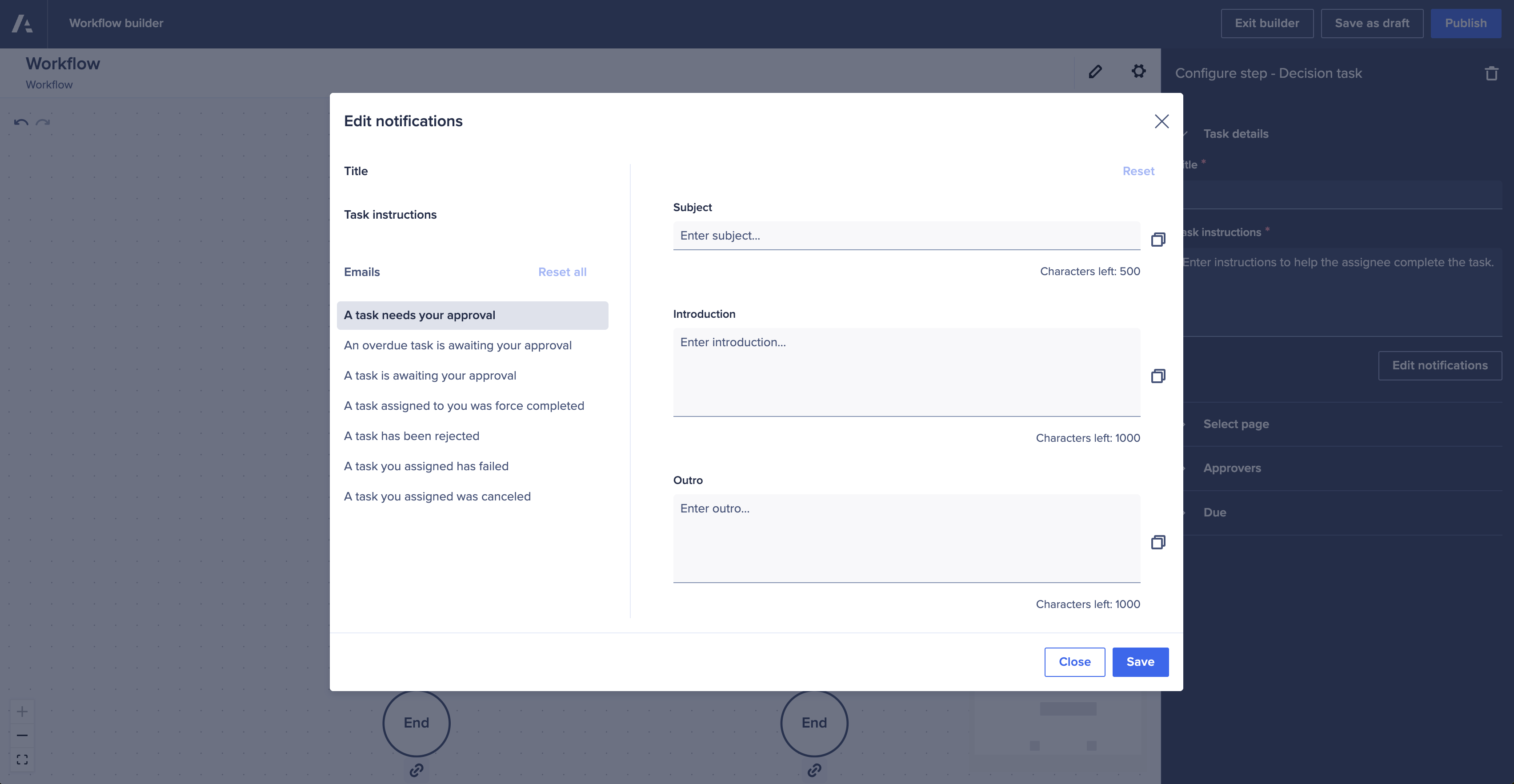 Workflow builders can now write their own notification emails, making them more intuitive and more actionable. Custom subject lines, intro text, and outro text make it possible to provide contextual guidance to users, allowing you to replace generic "You have been assigned a task" emails with a more tailored message that makes more sense to users who receive these notifications.