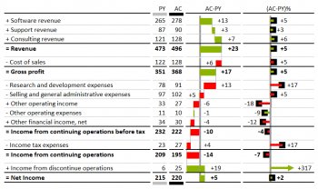 Compare account actuals to the previous year or plan with waterfall and percentage deltas.