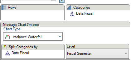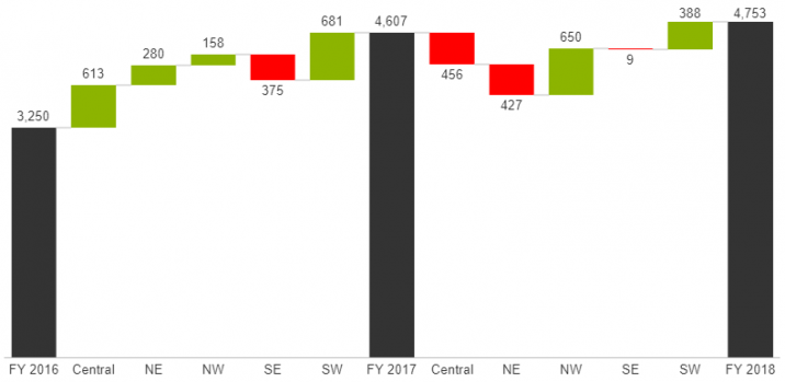 In the example below, FY 2016, FY 2017, and FY 2018 are the selected members in the Date hierarchy of Categories. In the Split Categories by section is the Organization hierarchy, with the five divisions as the selected members. This results in a waterfall chart showing how each division contributed to the variance over each year.