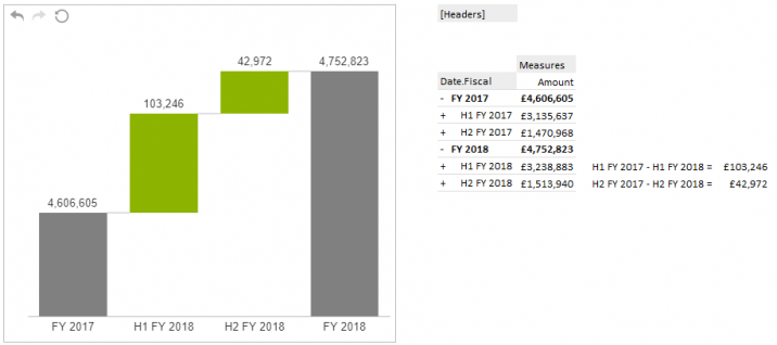 For example, in the chart below, the first half of 2018 had a value £103,246 greater than the first half of 2017, so this had a positive contribution to the change between FY 2017 and FY 2018.