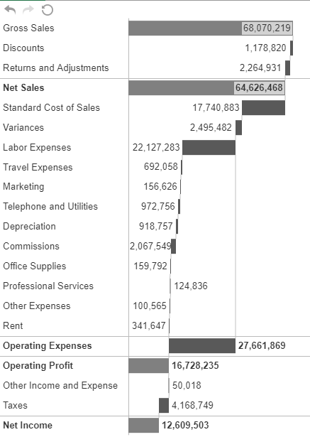 The Operating Expenses member is set as a subtotal on the Business rules sheet. Because Standard Cost of Sales and Variances aren't child members of Operating Expenses, and the previous total/subtotal is for Net Sales, the subtotal lines don't line up correctly. You instead want the line to connect from the Labor Expenses category.
