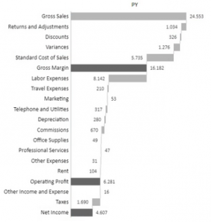 Show the structural breakdown of business attributes. Totals and sub-totals can be specified either on individual elements (right-click) or using member properties if available in the cube.