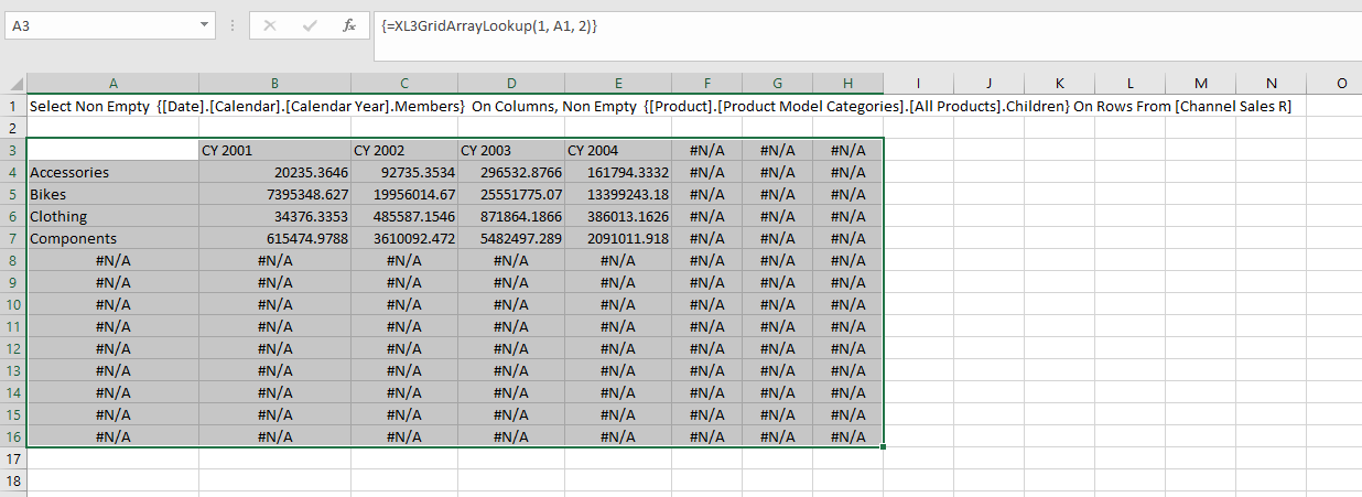 Returns the result of an MDX query as an array. This is a CSE/Array formula so must be entered into a range using Ctrl+Shift+Enter.